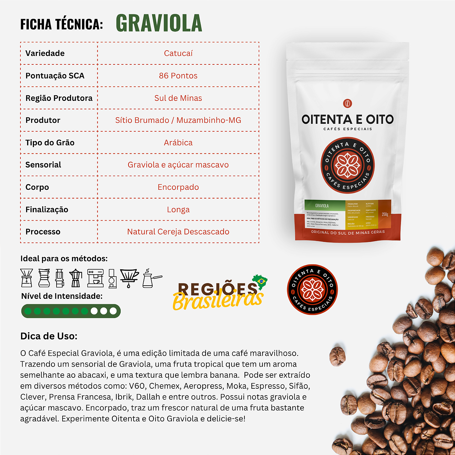 O Café Especial Graviola, é uma edição limitada de uma café maravilhoso. Trazendo um sensorial de Graviola, uma fruta tropical que tem um aroma semelhante ao abacaxi, e uma textura que lembra banana. Possui 86 pontos SCA que lhe garantem uma café suave, com acidez citrica leve e muito saboroso.