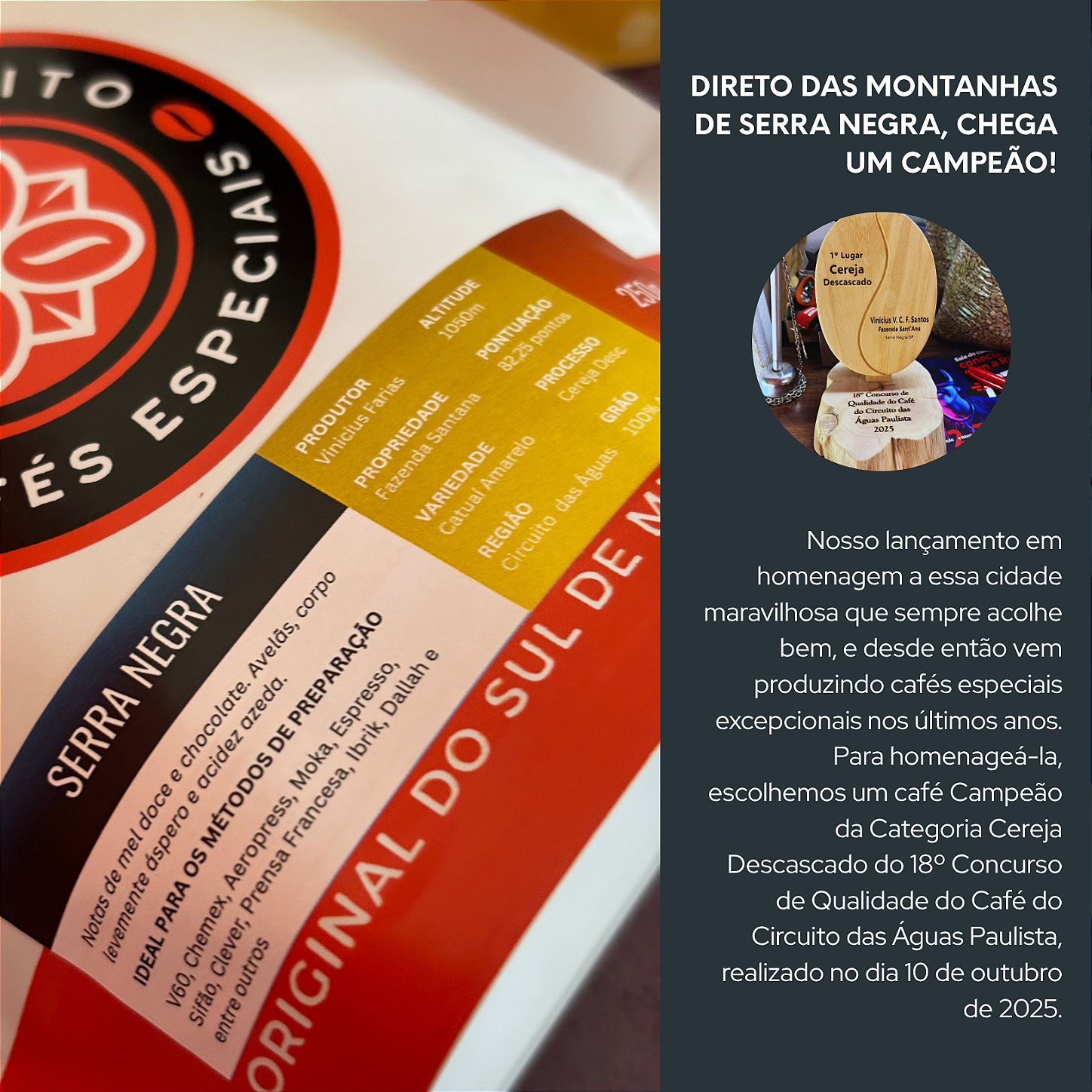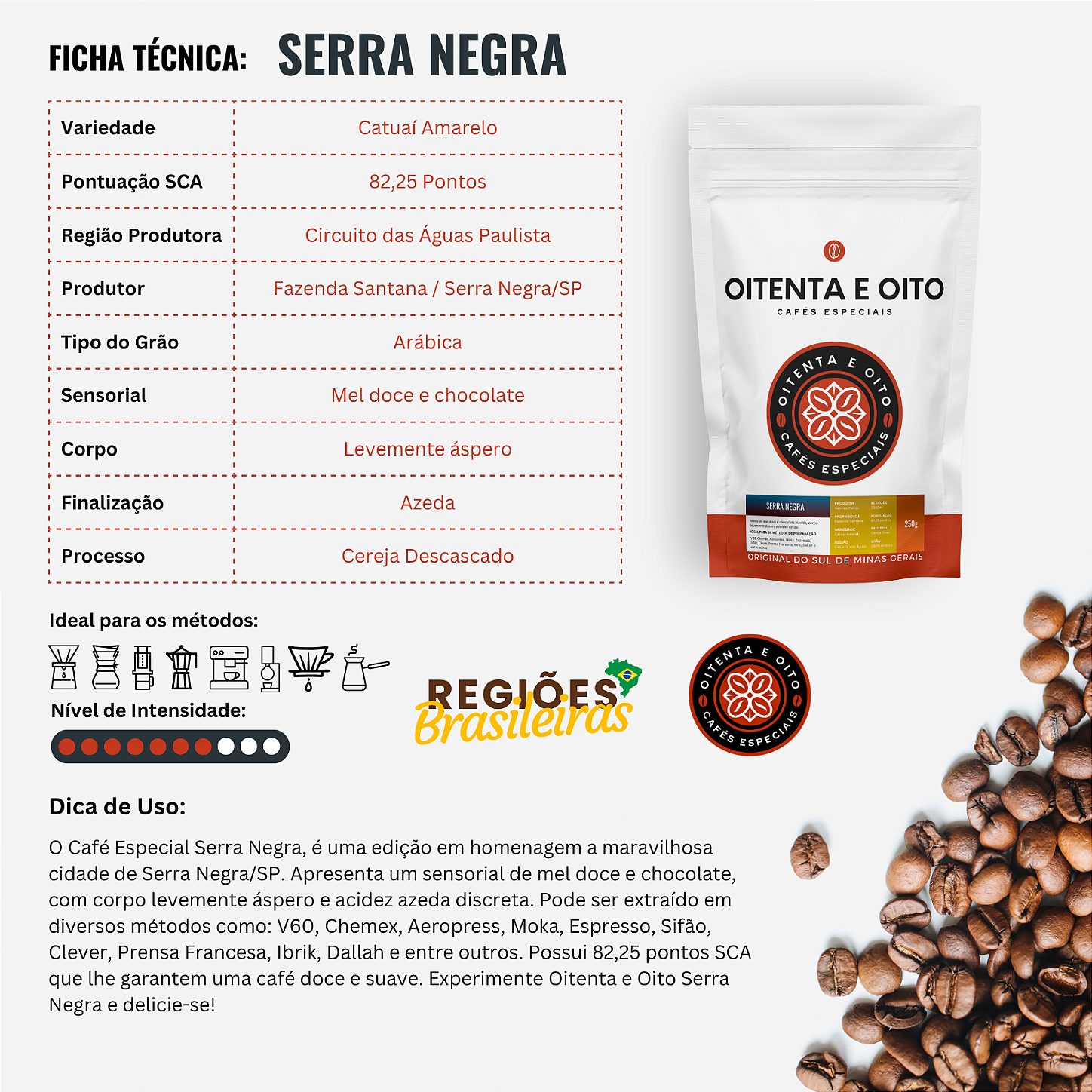 O Café Especial Serra Negra, é uma edição em homenagem a maravilhosa cidade de Serra Negra/SP. Uma cidade que sempre acolhe bem, e desde então vem produzindo cafés especiais excepcionais. Apresenta um sensorial de mel doce e chocolate, com corpo levemente áspero e acidez azeda discreta. Possui 82,25 pontos SCA que lhe garantem uma café doce e suave.